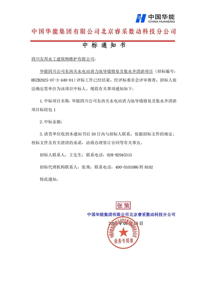近日,我公司再传喜讯——凭借深厚的项目施工沉淀、科学完善的技术方案以及公认的良好市场口碑,成功中标华能四川公司东西关水电站消力池导墙修复及集水井清淤项目。此次中标,不仅标志着我公司在嘉陵江流域中的水电站项目实现了又一重要突破,更成为公司业务拓展征程上的一个新的里程碑。